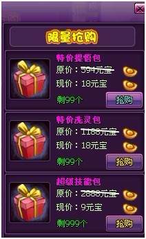 活动期间仅三天,伙伴、锻造、异火界面增加超值限量礼包【特价物攻包,特价斗攻包,特价闪避包,特价体悟包,特价洗灵包,超级技能包,特价强化包,特价打孔包,特价镶嵌包】,活动期间每天限量出售,不要错过机会喔!