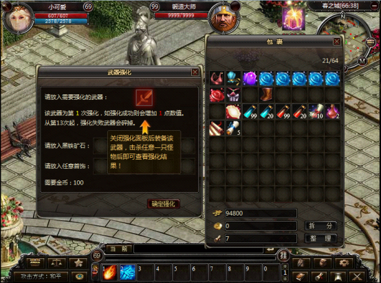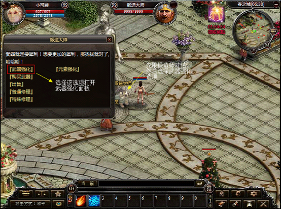 1、在锻造师处即可进行武器强化。华景村(99,32)和春之城(66,38)分别有一位锻造师。