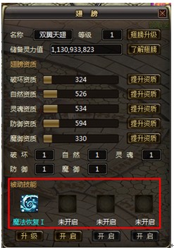 每个翅膀最多可以添加4个被动技能,并且这4个被动技能可以进行升级,每个技能最高可提升到10级。翅膀的被动技能搭配将决定角色后期的成长方向。